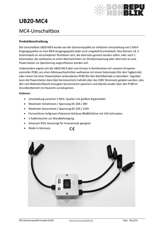 Ursprünglicher Preis €0,00 - Ursprünglicher Preis €0,00Ursprünglicher Preis €0,00€49,00€49,00 - €49,00Aktueller Preis €49,00| /Die Umschaltbox UB20-MC4 wurde von der Sonnenrepublik zur einfachen Umschaltung von 2 MC4- Eingangsquellen an eine MC4-Ausgangsquelle (oder auch u...