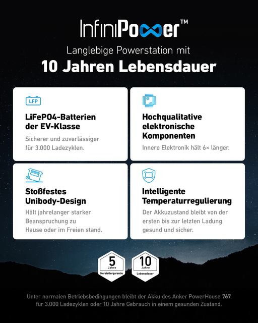 Anker 767 PowerHouse 2300W Features 10 Jahre Lebensdauer: Mit unserer leistungsstarken Technologie InfiniPower, kombiniert mit LiFePO4-Akkus, ...
